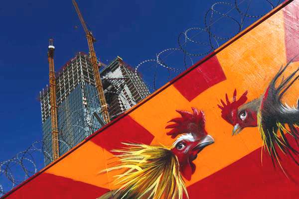 Et comme les aléas de mon organisation matérielle me laissent peu de temps pour préparer ce billet, je vous propose une galerie que j’avais mise de côté. D’un autre mur. Celui qui protège le chantier de la future Banque centrale européenne, sur le site de l’ancienne Großmarkthalle (marché de gros), à Francfort-sur-le-Main, en Allemagne. Un mur tagué aux frais de la banque elle-même qui a offert aux artistes de quoi colorer ses palissades : plusieurs dizaines de milliers d’euros selon les uns, juste 10 000 € selon les autres. Quoi qu’il en soit une broutille comparativement au 1,3 milliard d’euros que devrait au final coûter la banque.